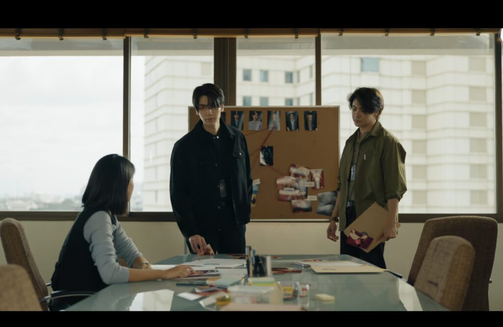Jade and Kamin have a suspect board with the red string that… I don’t think cops do that. Also, are they having a “meeting” with one person? What is happening?