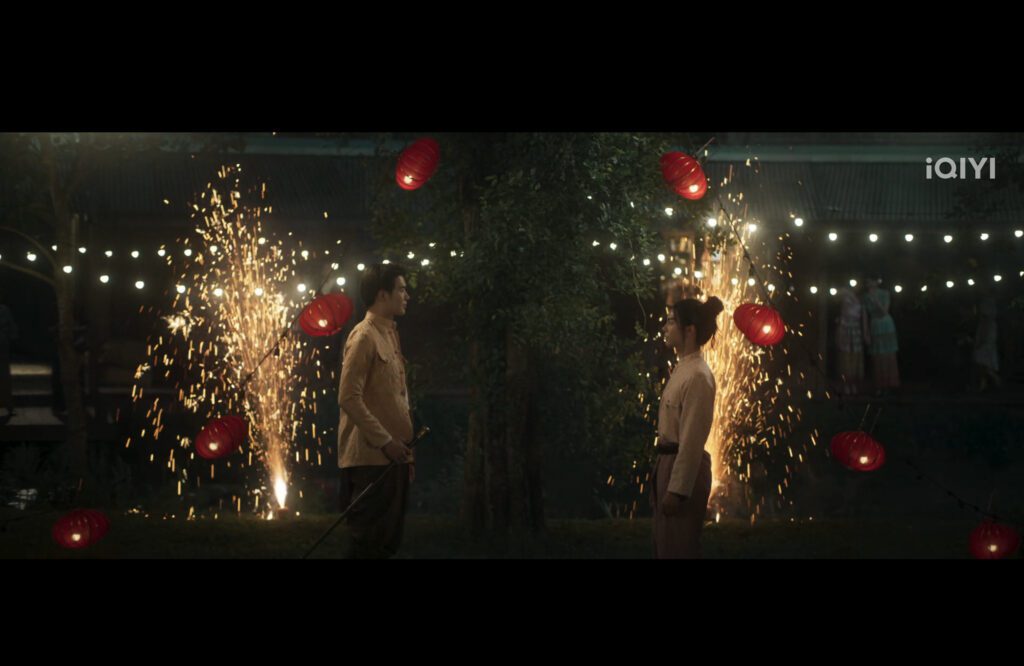At home, Sophee whines at Yai until he takes her out to shop and see fireworks. But he abandons her the minute he sees Long-Haired Kaew there. Yai walks up to him, they stare, and the fireworks and OST go all in.