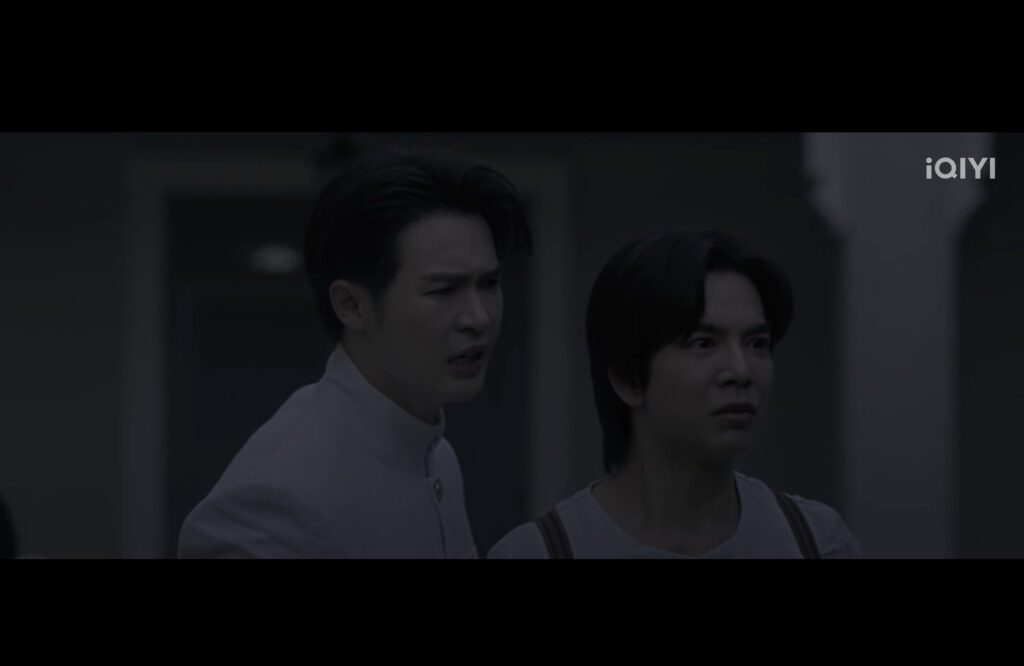 He does, seeing Yai putting it on Long-Haired Kaew’s finger. Then, Yai seems to appear behind him and says something about the old times, but he’s not there.