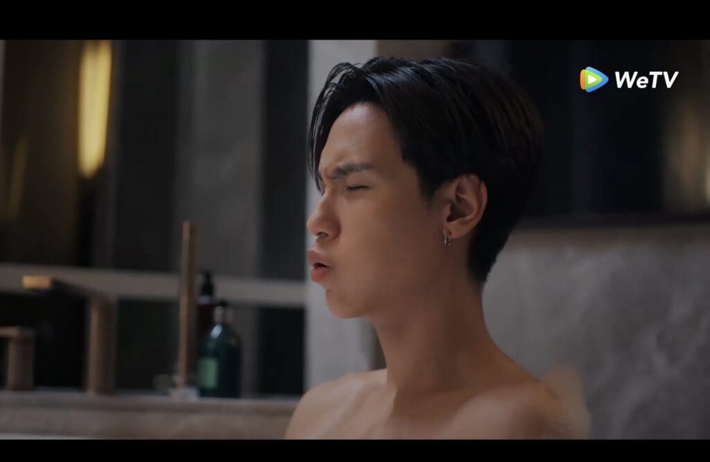 He bathes alone, reminding himself not to fall in love with the target. But the target gets in the tub with him. Those two key stickies fall off as Tim goes in for the kiss.